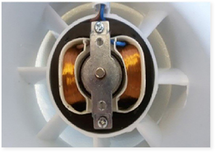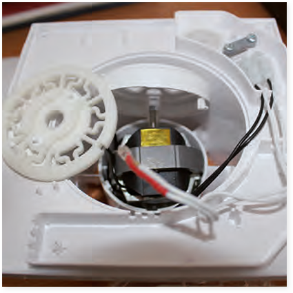 5. Двигатель жестко закреплен в корпусе вентилятора при помощи 2-х винтов. В задней части вентилятора имеются отверстия, закрытые пластиковыми заглушками, под эти винты.